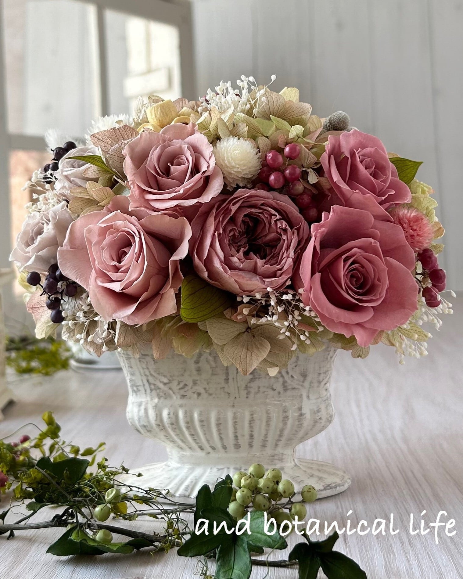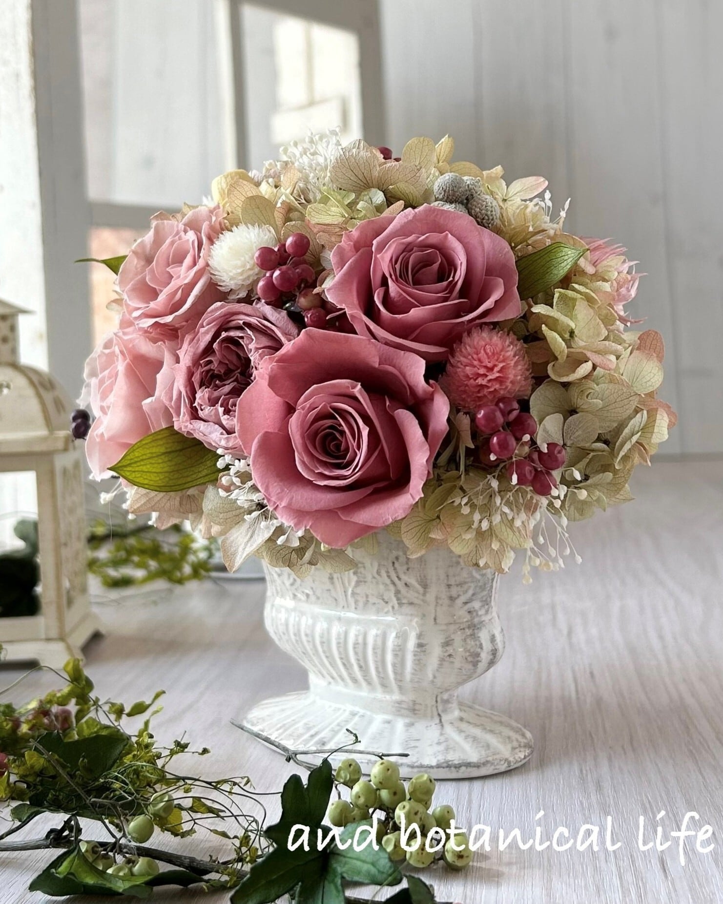 【受注制作】優雅なくすみピンクローズのアレンジメント/プリザーブドフラワー/母の日/結婚記念日/誕生日/開店祝い/引越し祝い/ご長寿お祝い/各種お祝い/アンティークローズ | and botanical life