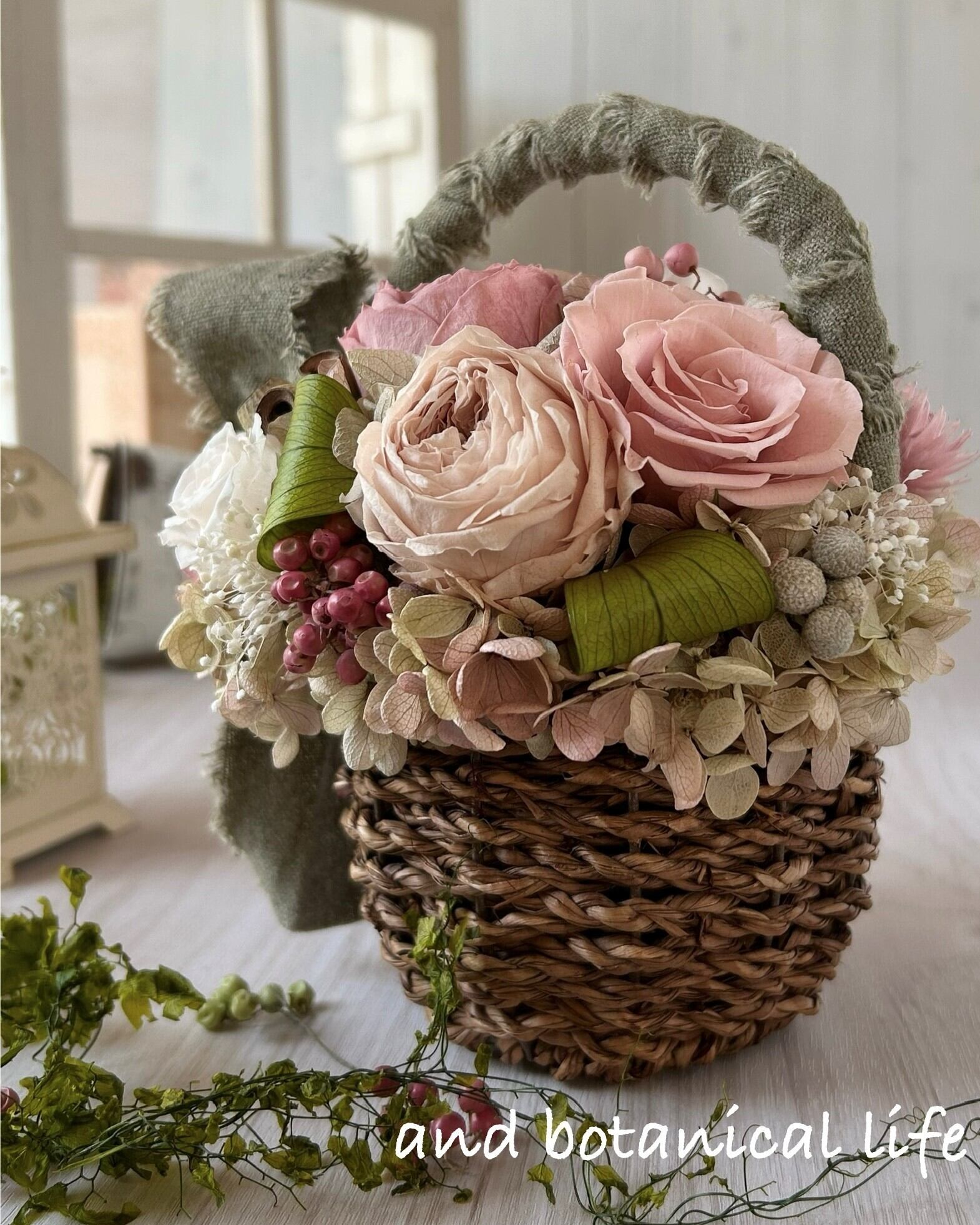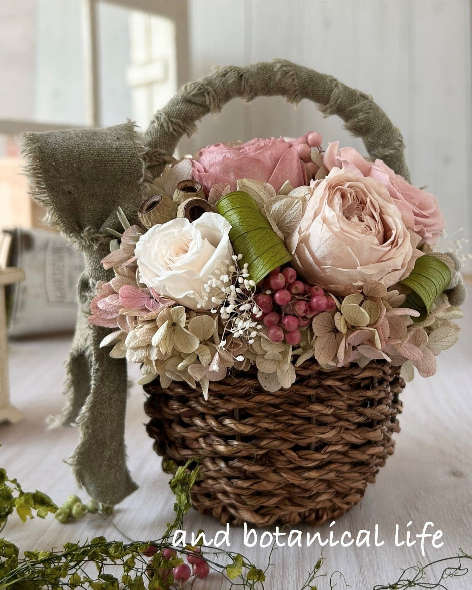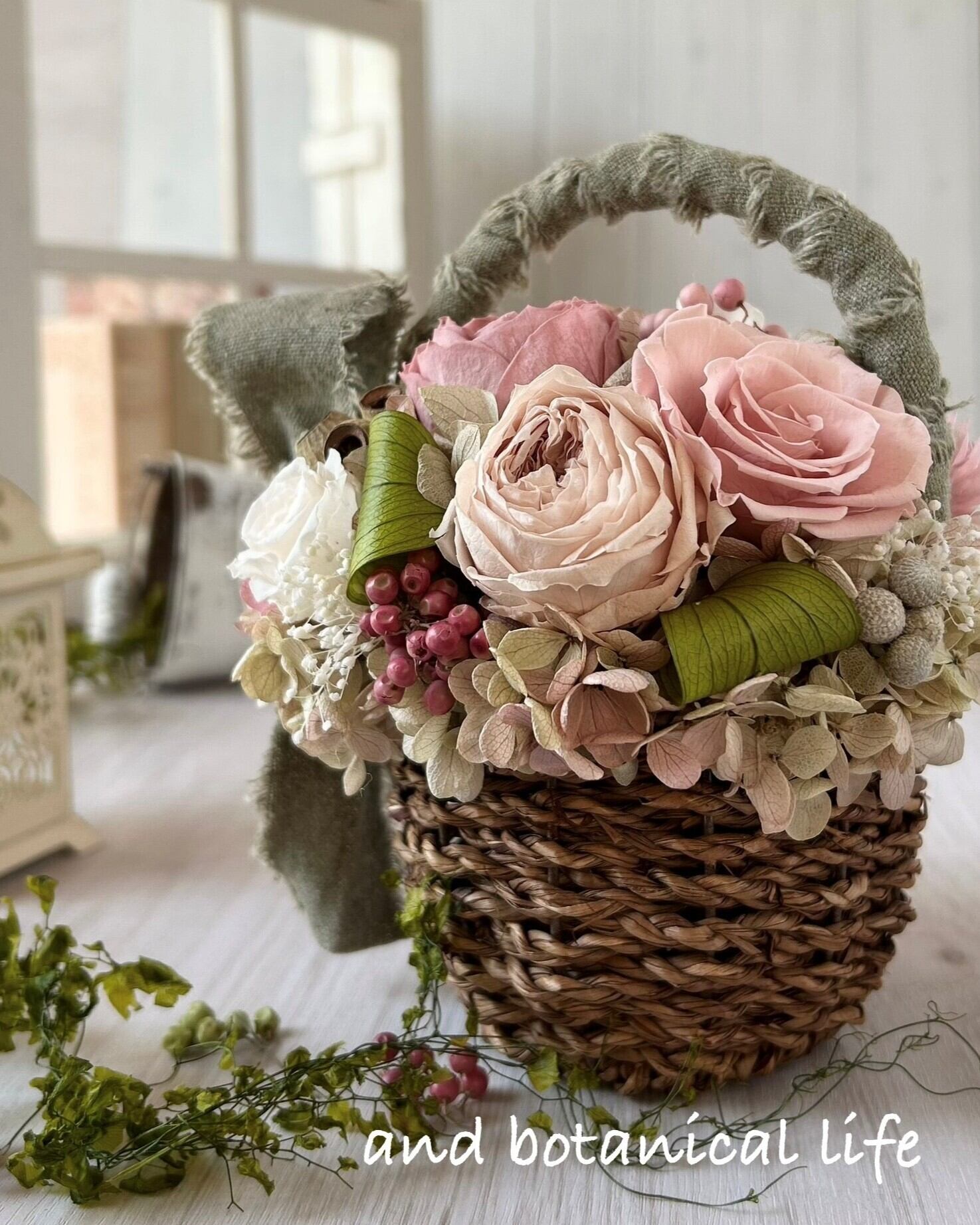 プリザーブド:ローズ(モーブピンク他)、アジサイ(各種)、かすみ草、葉(ルスカス)