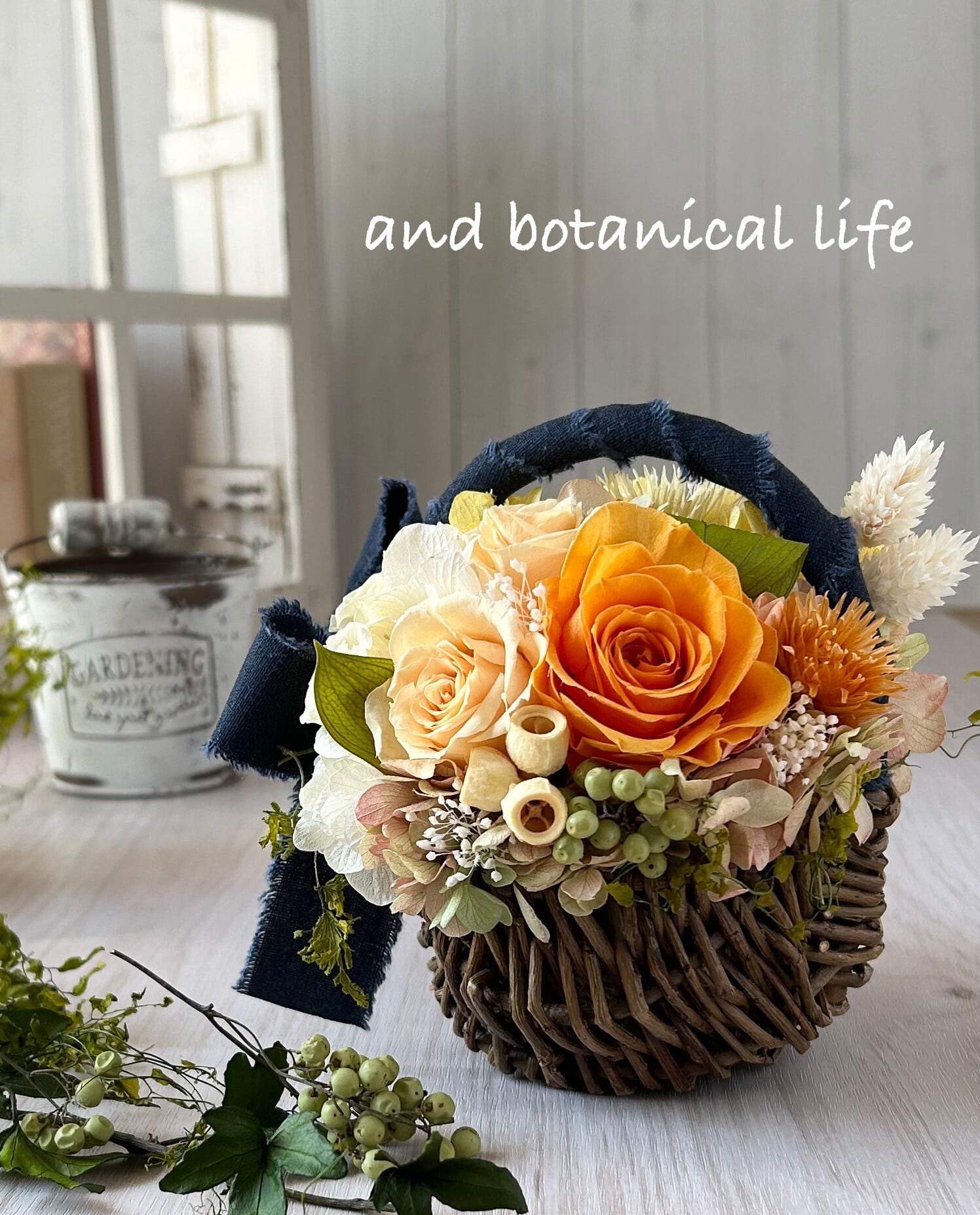 プリザーブド:ローズ(フルーティオレンジ他)、かすみ草、葉(ルスカス)