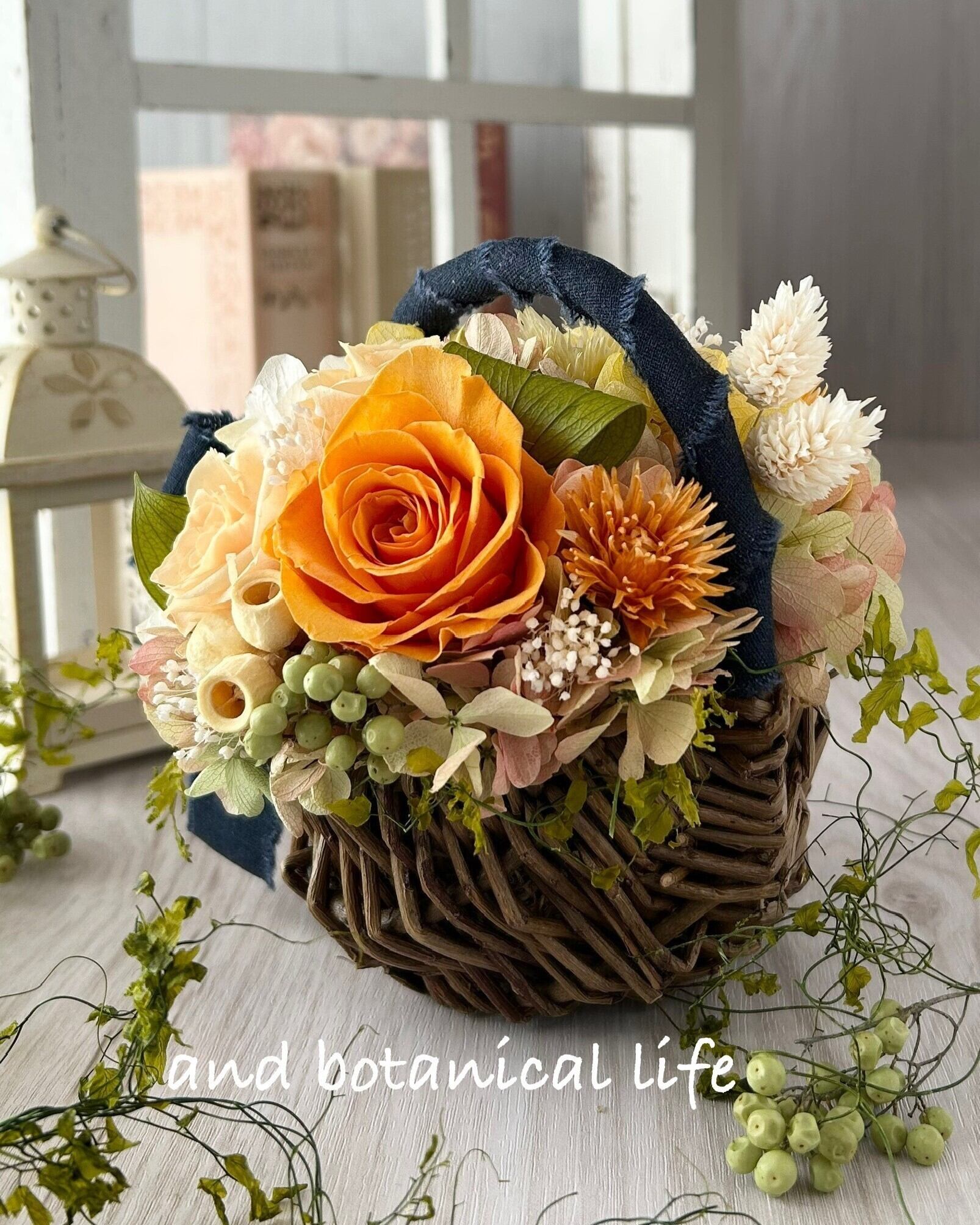ドライ:シルバーデイジー、ペッパーベリー、ポアプランツ、アンバーナッツ