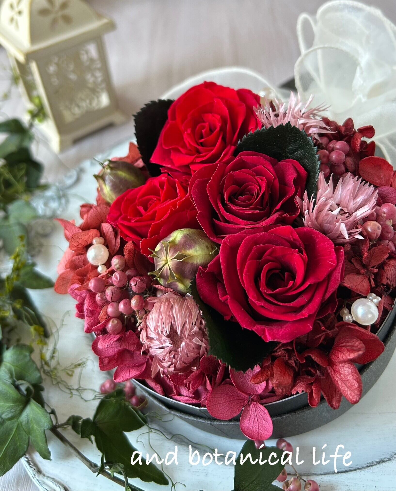 プリザーブド:ローズ(クィーンレッド他)、アジサイ(各種)、葉(薔薇の葉)