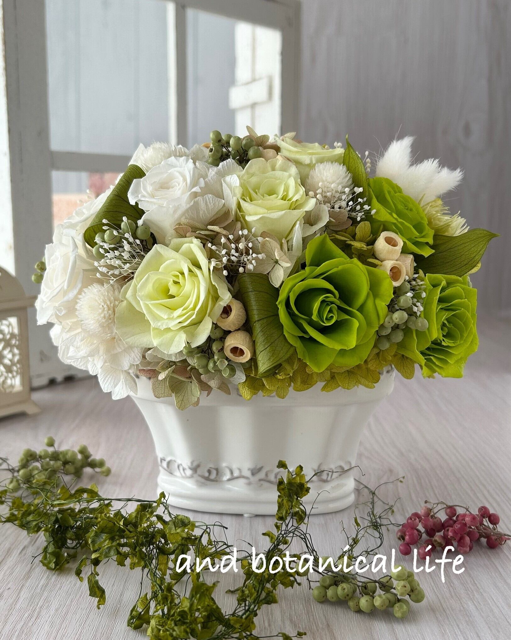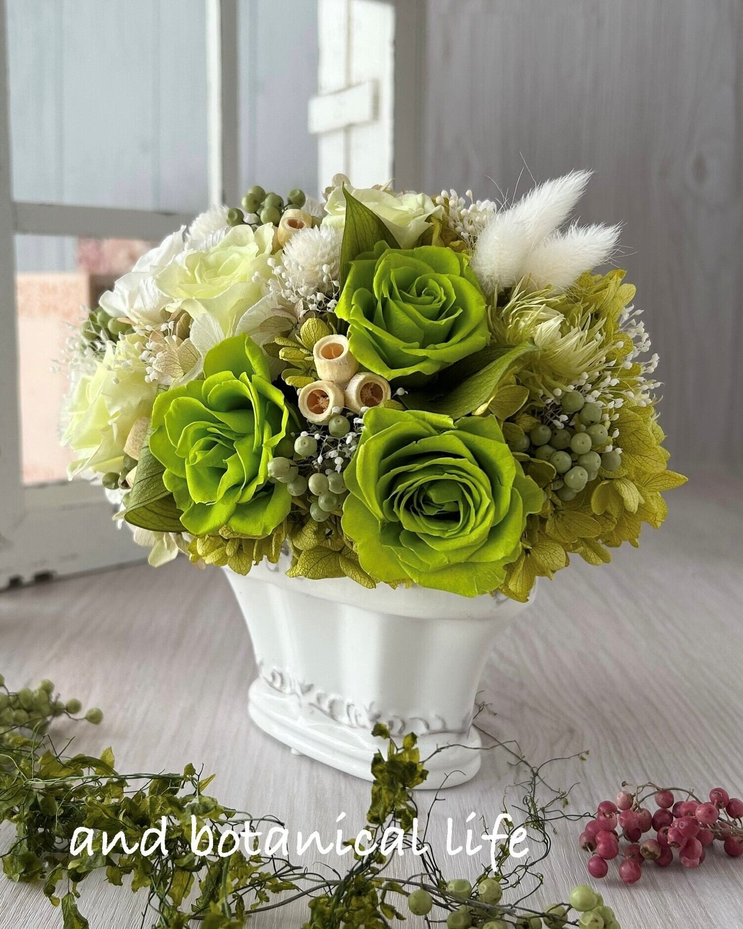 プリザーブド:ローズ(グリーン他)、アジサイ(各種)、葉(ルスカス)千日紅、かすみ草