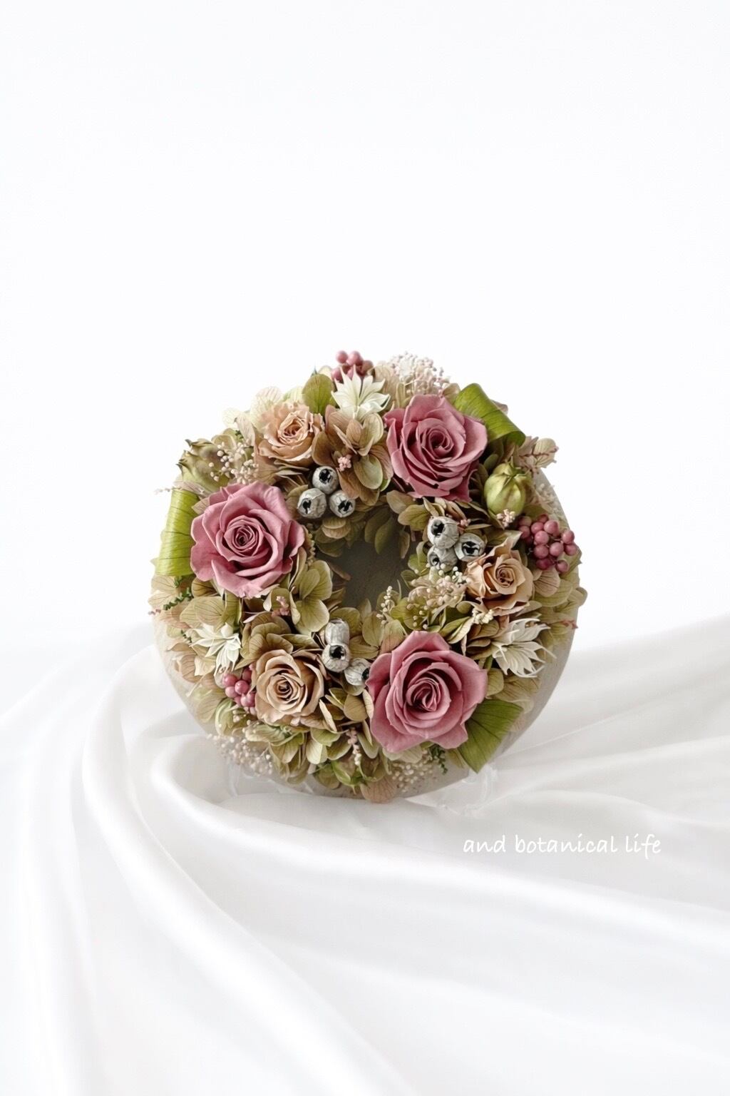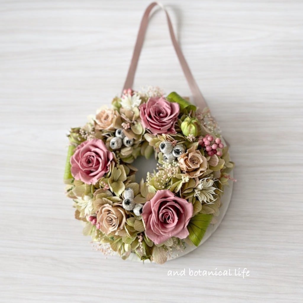 【受注制作】ふんわり円を結ぶロゼのボタニカルリース/プリザーブドフラワー/結婚祝い/開店祝い/新築祝い/円満/縁起物/大人可愛い/くすみピンク/ナチュラルインテリア/フラワーギフト | and botanical life