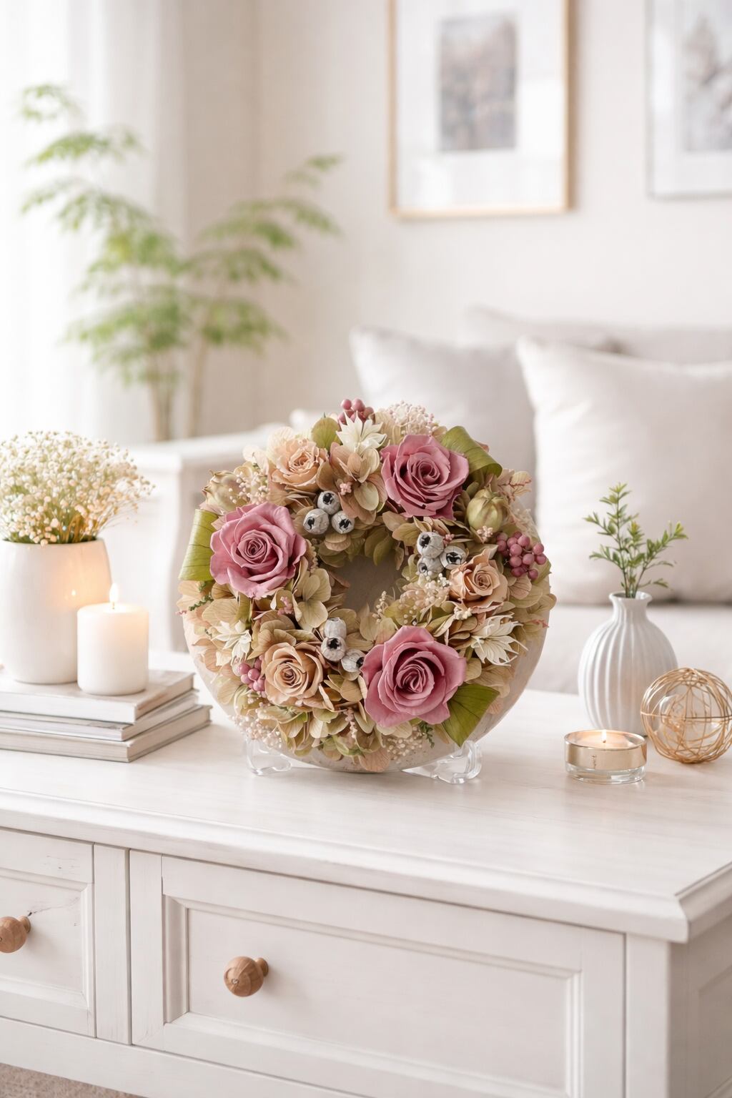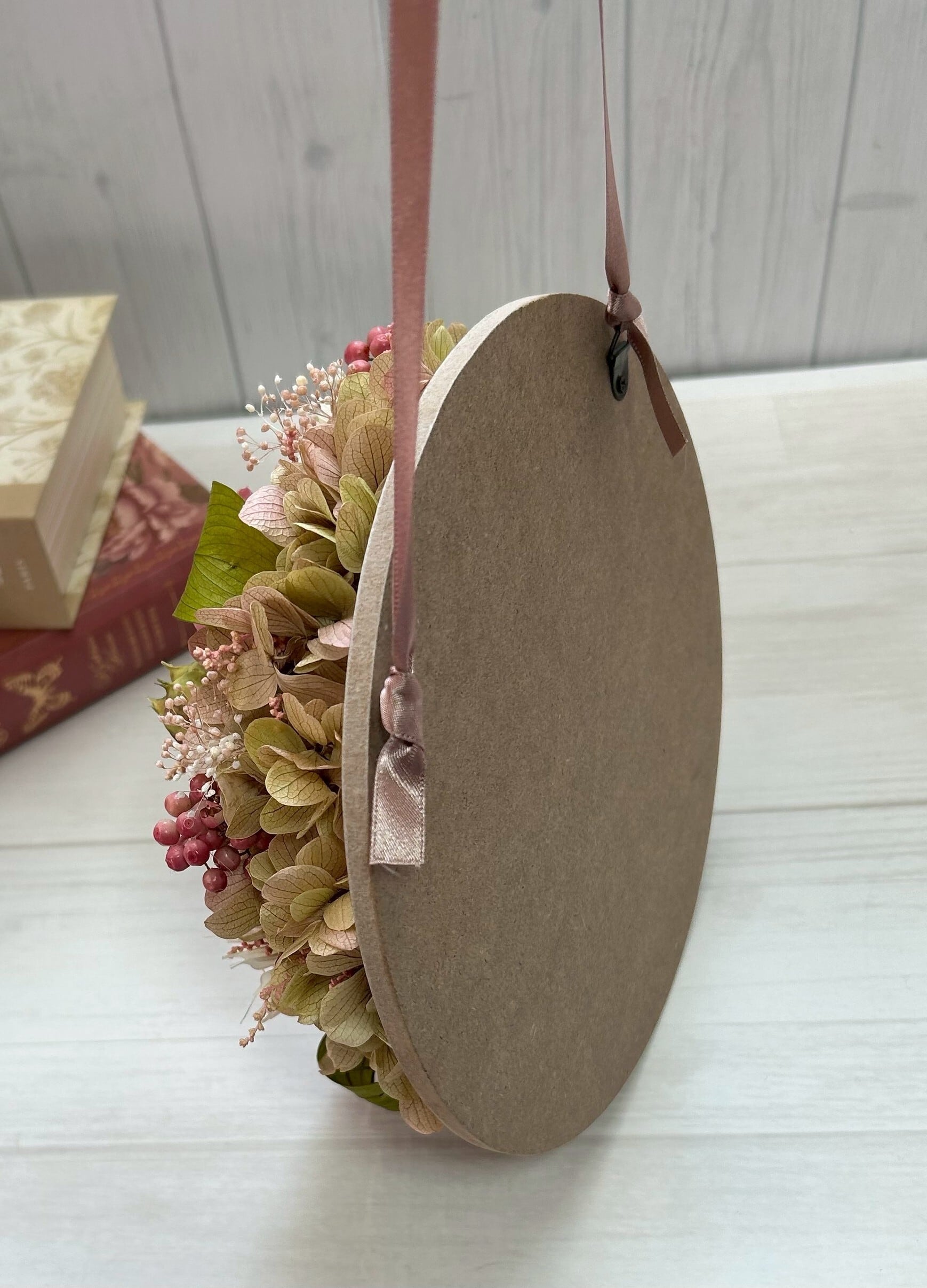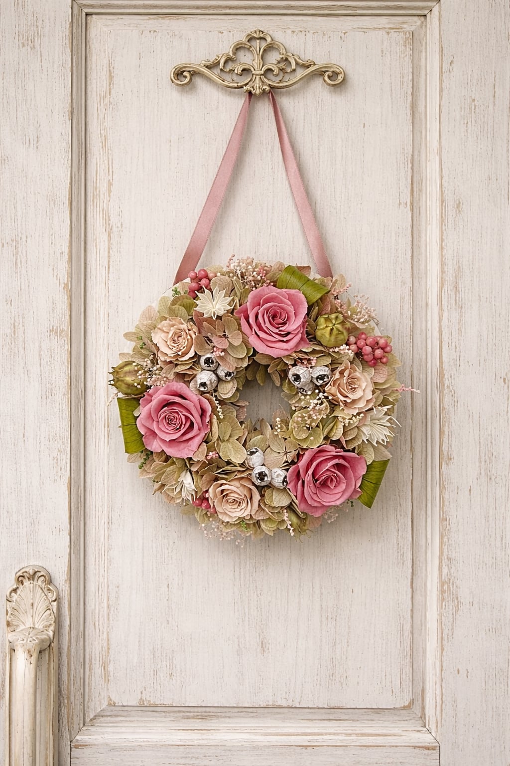 特別な日を彩る、心温まる「ふんわり円を結ぶロゼのボタニカルリース」です。