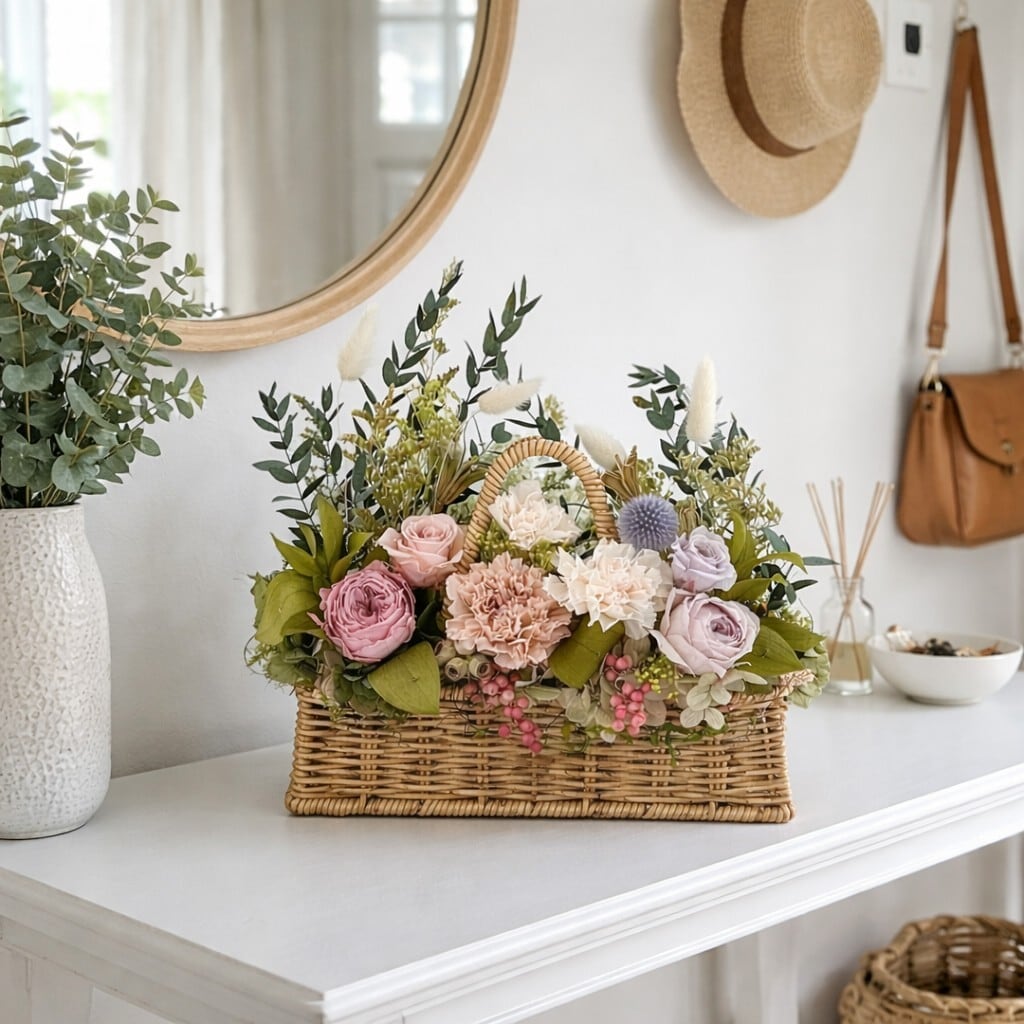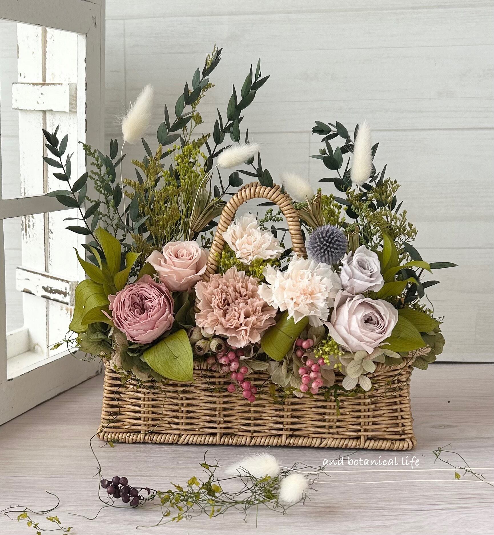【受注制作】パリスタイル アレンジ ローズとグリーンのナチュラルバスケット /プリザーブドフラワー/開店祝/引越し祝/母の日/誕生日/ナチュラル/くすみピンク/大人可愛い | and botanical life