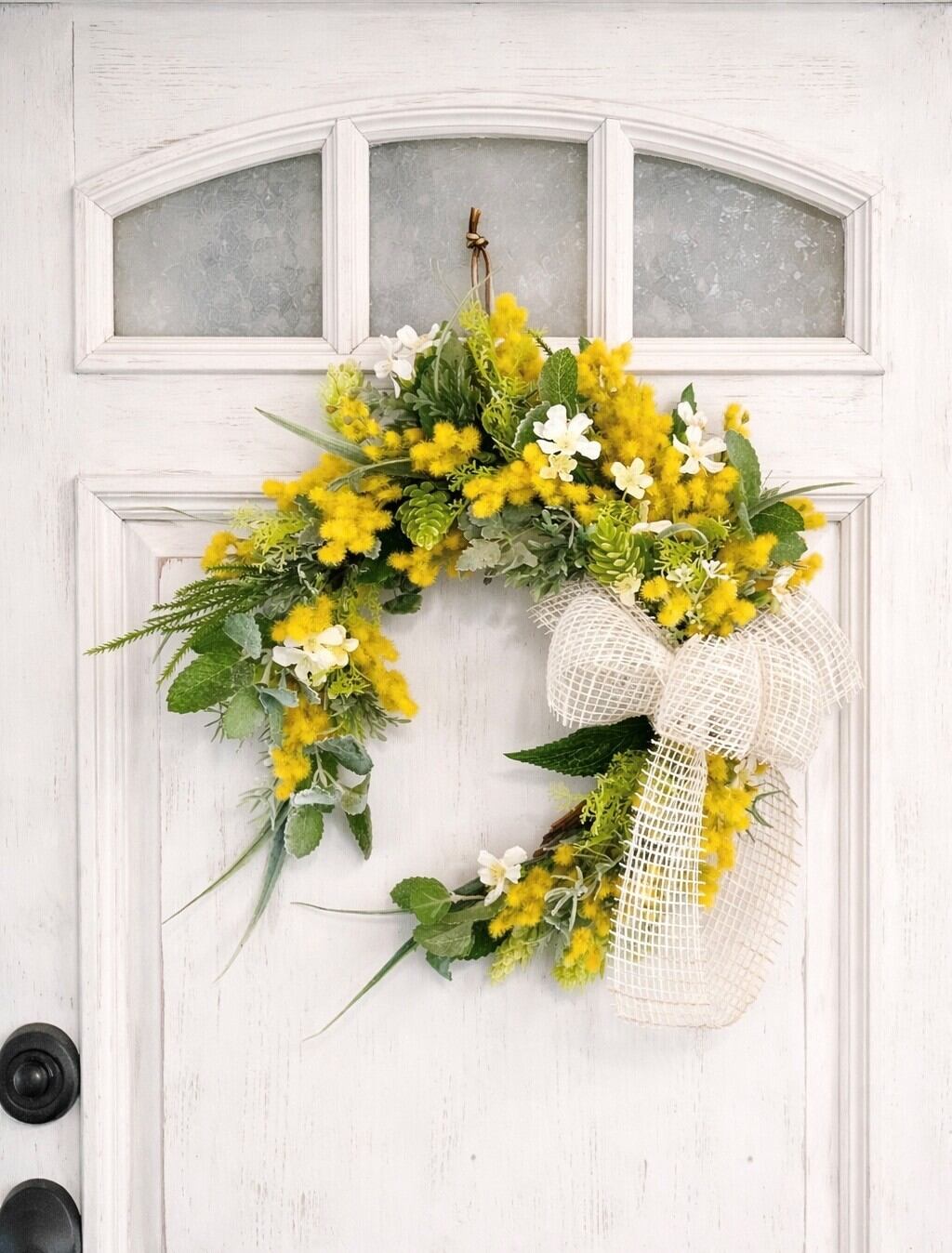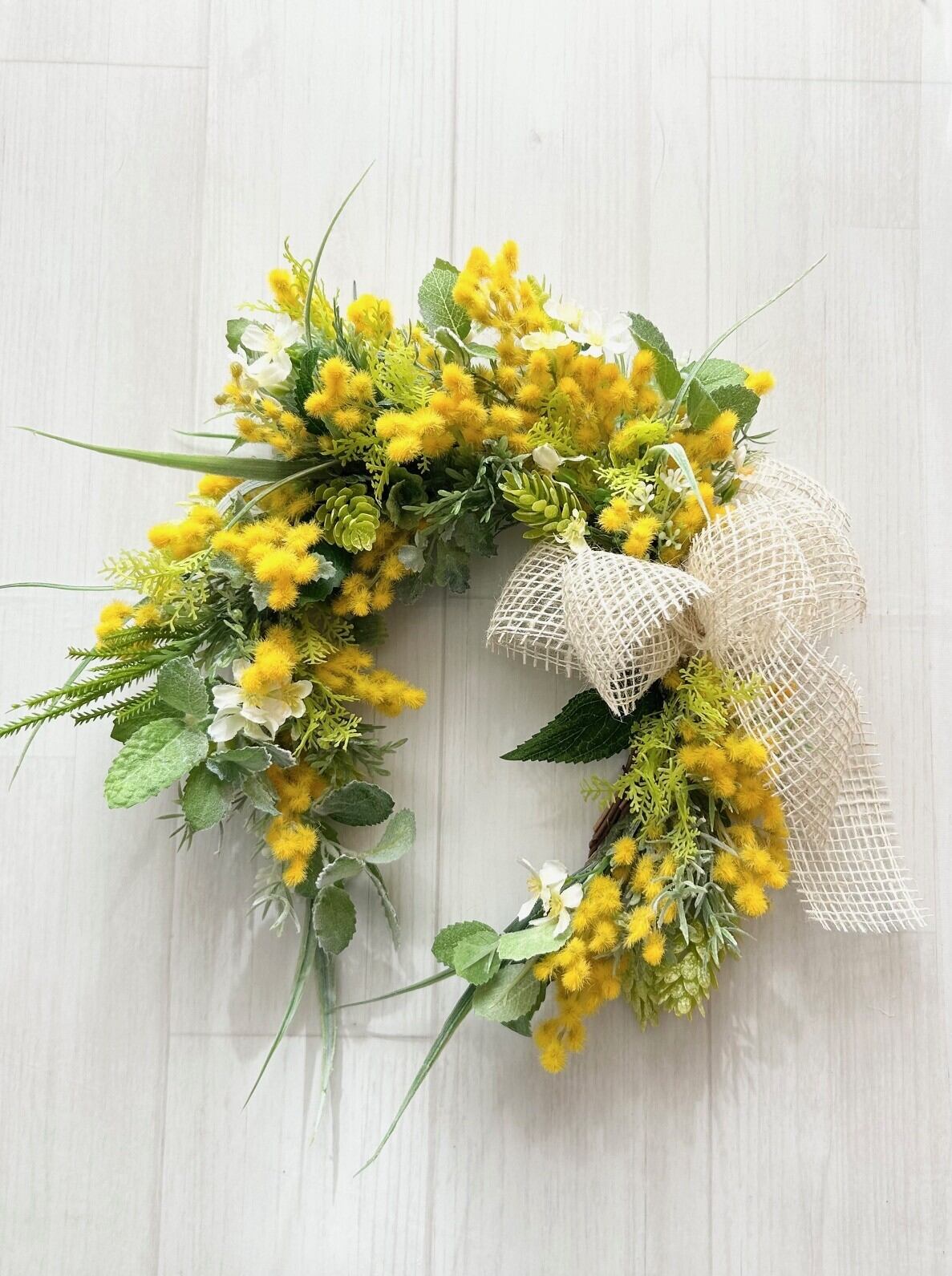 アーティフィシャルフラワー:ミモザ(イエロー)、葉物、小花他、選び抜かれた素材の組み合わせが、リアルな美しさを感じさせてくれます。水やりやメンテナンスは不要で、どんな時期にも楽しむことができます。