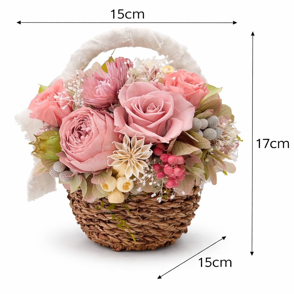 プリザーブドフラワーとてもデリケートですので、優しく扱ってください。直射日光や高温多湿を避け、風通しの良いところに置くことで、その美しさを保ち長く楽しめます。乾燥すると花びらがひび割れします。衣類、床、壁等に直接触れると色移りする場合がございますので、ご注意ください。水やりは不要ですが、埃が付いた場合は柔らかい筆などでそっと取り除いてください。