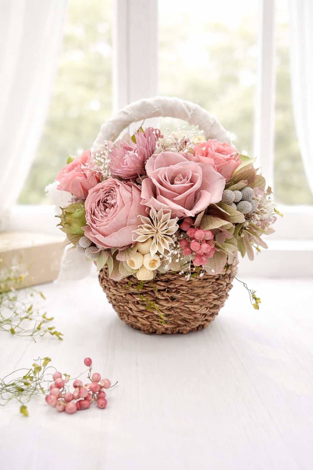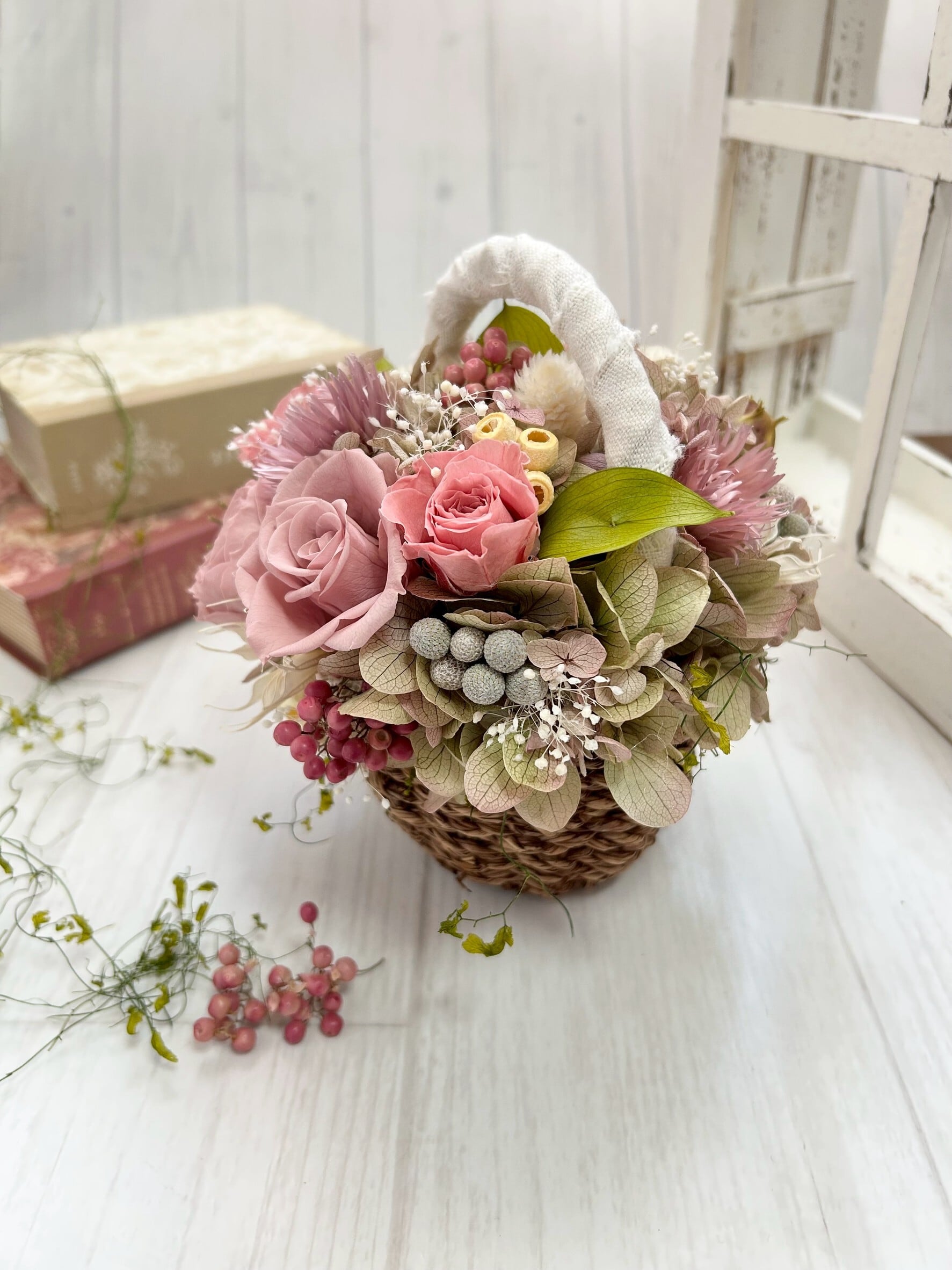 くすみピンクのバラを中心に、小花や実ものを丁寧に重ね、華やかさと落ち着きを兼ね備えた上品な雰囲気に仕上げました。